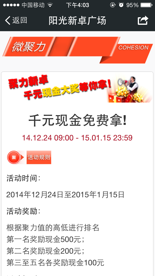 阳光新卓广场开启“聚力新卓,千元现金大奖等您拿”活动以来,受到了小伙伴们的广泛关注,为了让大家更好地参与活动,我们教你如何玩转“聚力”,轻松问鼎现金大奖!