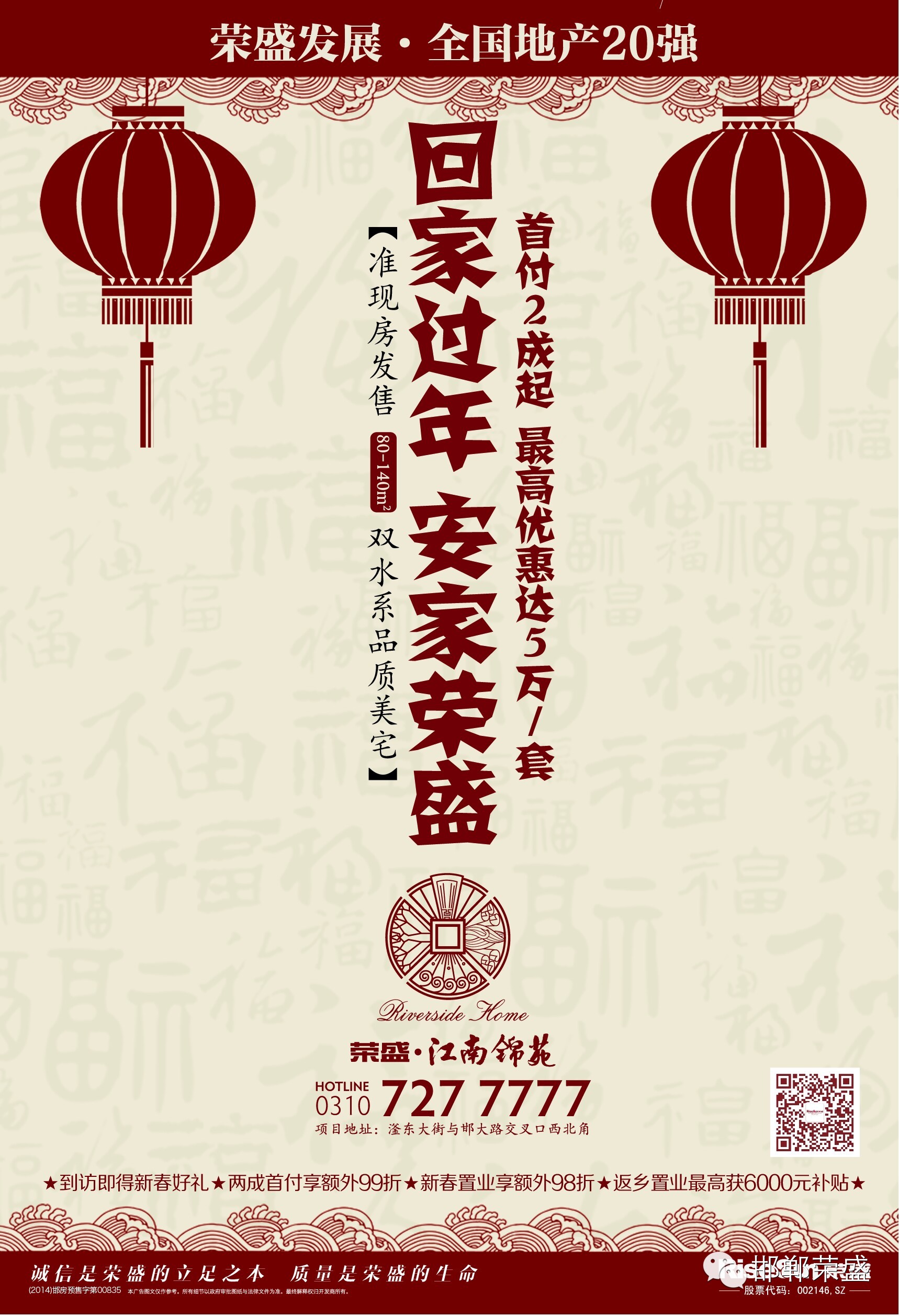 摘要:过年买房 首选荣盛!新春好礼 最高优惠5万元 祝您安家!超低两成首付起,最高可享4%优惠,新春置业所有房源享受2%优惠。返乡置业最高可享6000元住房补贴,老业主介绍成交可得1000物业费抵用款!荣盛·江南锦苑上市房企 让您放心到底