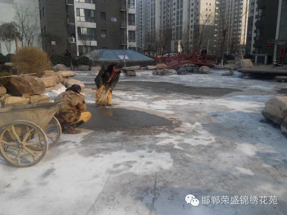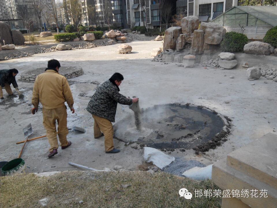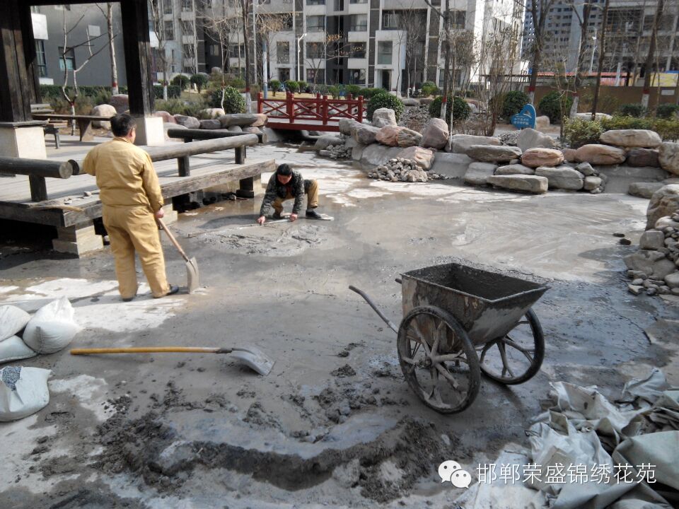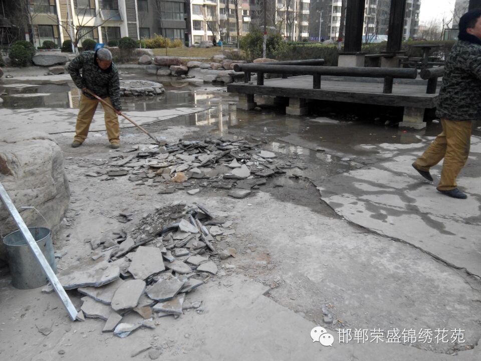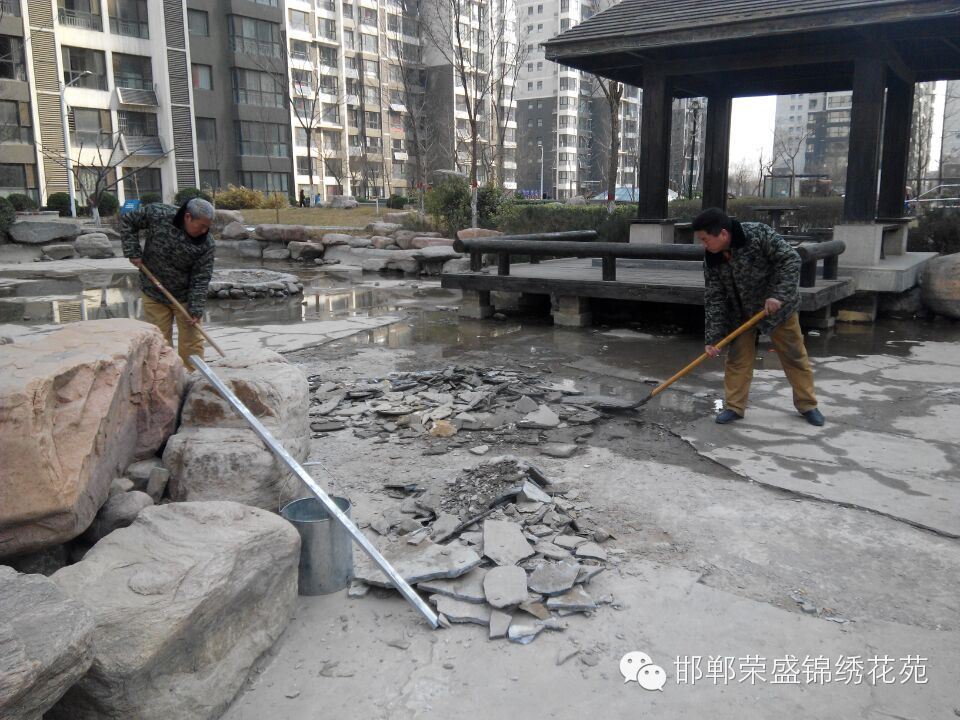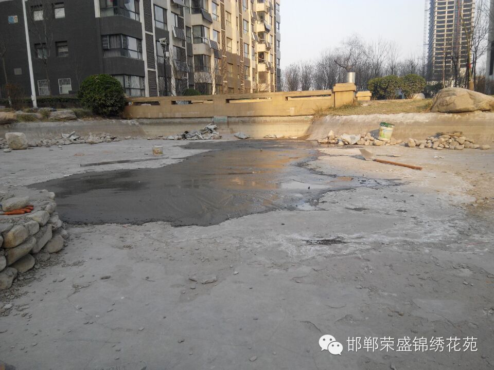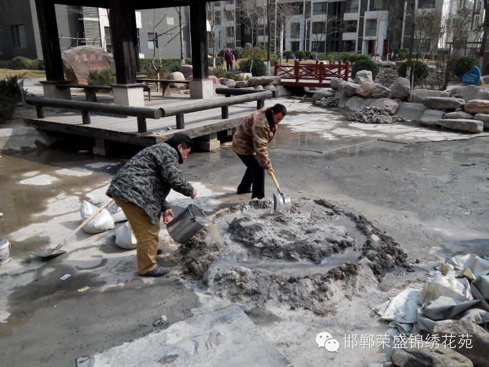 锦绣花苑小区物业维修部针对小区水系湖底破损处进行全面修补,共消耗29袋水泥、60袋沙子、90袋石子、4天14人次。确保小区水系随时供水,在此请各位业主看管自己的孩子,不要在水系中玩耍用石头敲击损坏水系湖底。共同维护我们美好家园。
