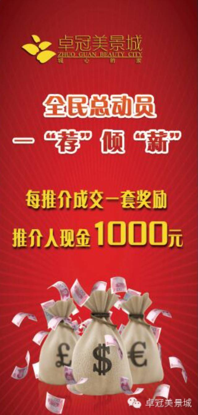 摘要:重赏之下必有勇夫,卓冠美景城现推出全民大营销!凡向卓冠美景城推荐成交的业主,每推介成交一套奖励推介人现金1000元。你没听错!是现金入账哦!
