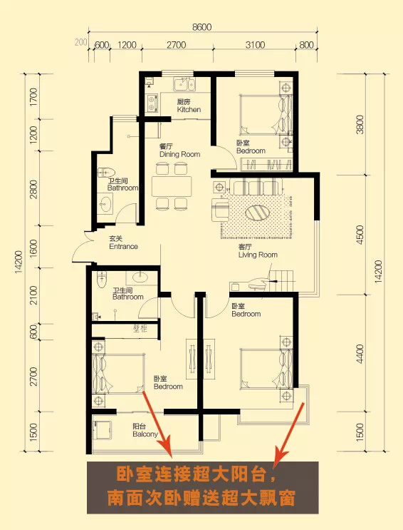 1、宽大客厅,设景观阳台,方正通透,尺度阔绰
