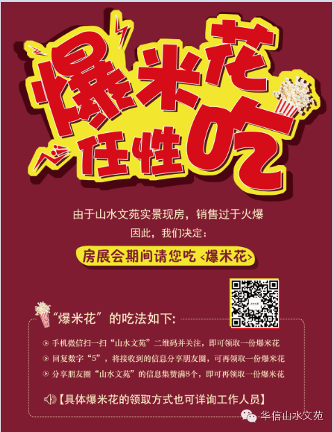 亲临大剧院广场展会现场即可在山水文苑展位前领取爆米花一份!售楼中心还有神秘优惠等着您哦!