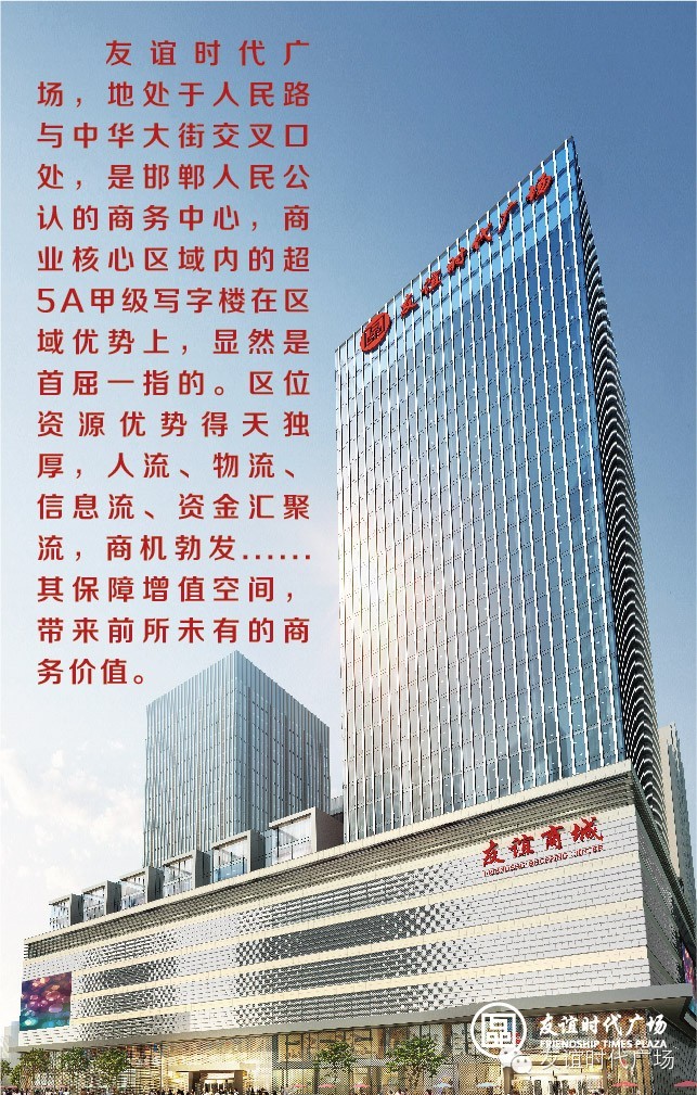 友谊时代广场项目位于邯郸商业核心区域,由大连友谊(集团)股份有限公司(证券代码000679)投资,项目占地面积约1.8万平米,总投资近15亿元,是集国际高端购物中心,国际5A甲级写字楼、金顶商铺、金钻商铺、精品超市于一体的国际级城市综合体。项目周边交通便利,配套丰沛。