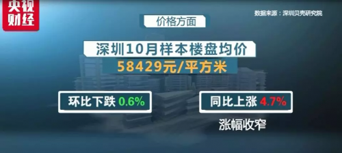 价格方面,深圳贝壳研究院数据显示,深圳10月样本楼盘均价为58429元/平方米,环比下跌0.6%,同比上涨4.7%,涨幅收窄。